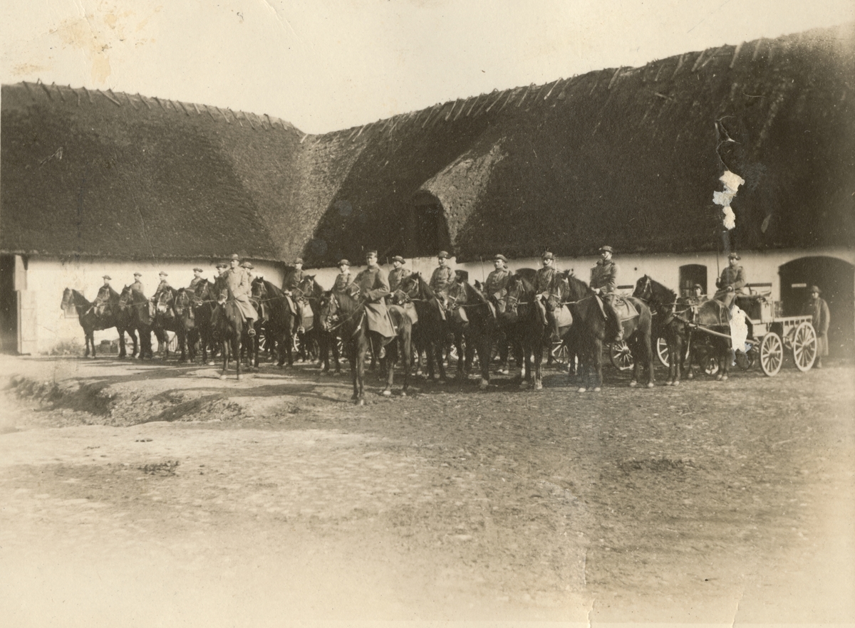 Titel: En grupp soldater från Positionsartilleriregemente A 9 till häst framför en lada.