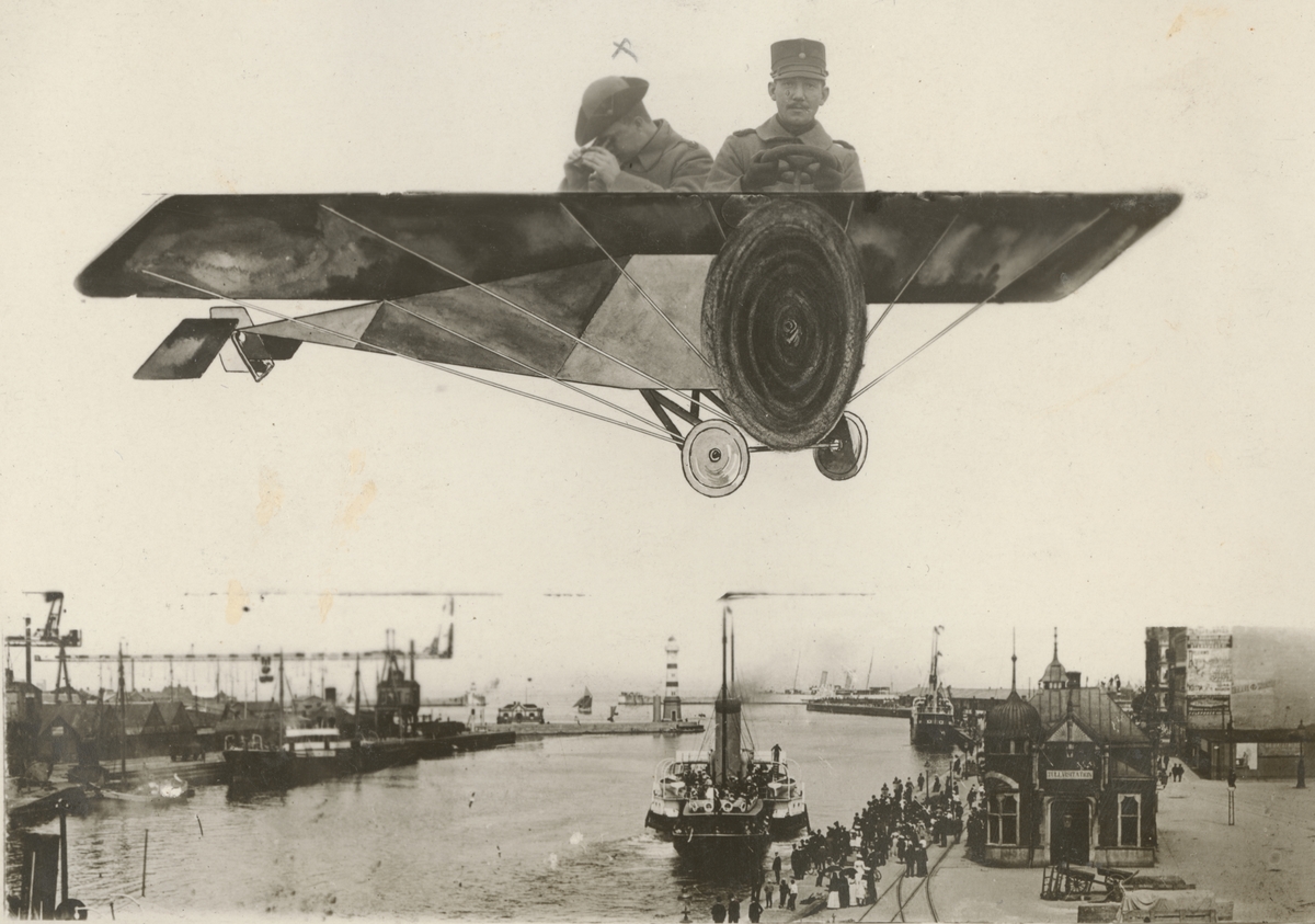 Titel: Bildmontage med två soldater som flyger över hamn med ett flygplan.