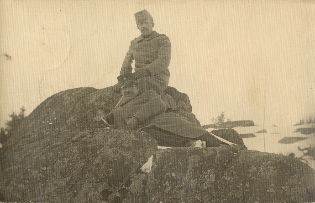 Titel: Två soldater från Positionsartilleriregemente A 9 på en stenhäll.