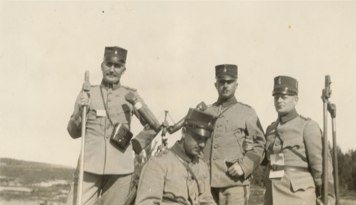 Titel: Gruppbild med fyra soldater från Positionsartilleriregemente A 9.