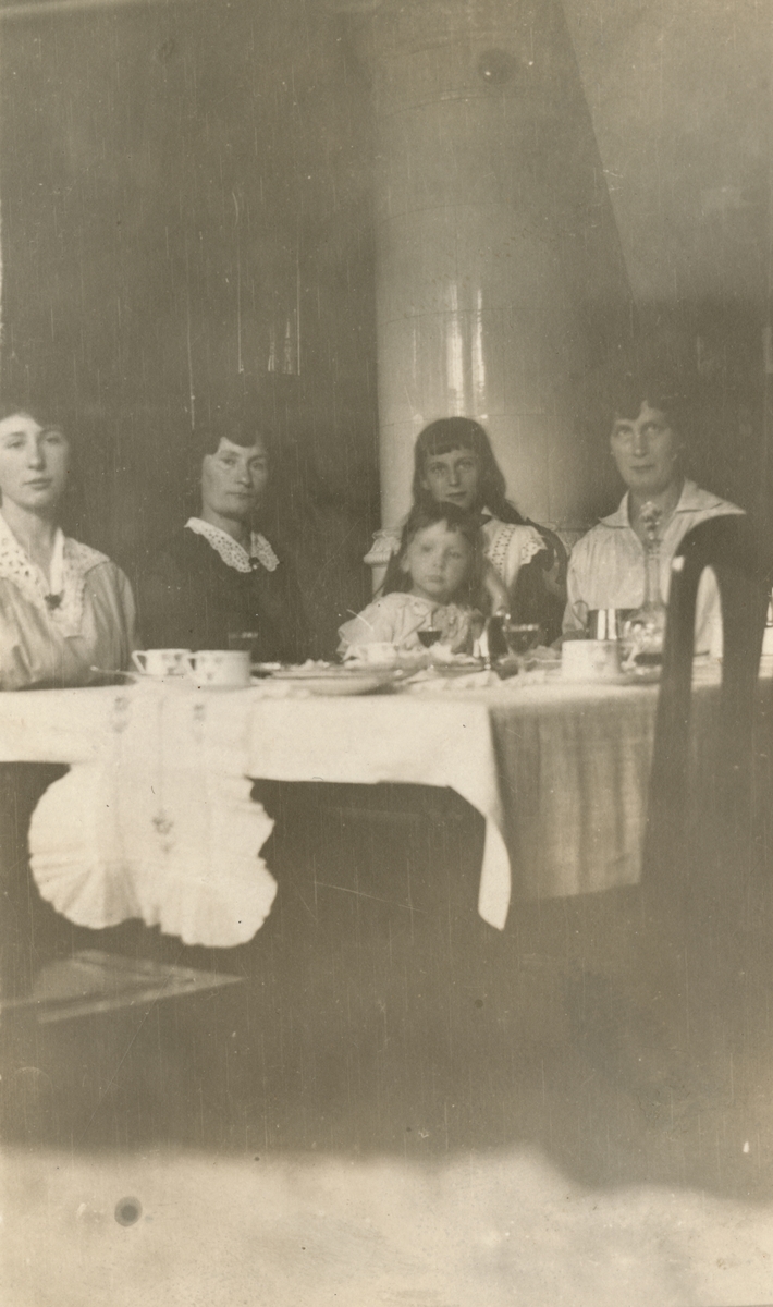Titel: En grupp kvinnor och barn samlade kring matbordet.