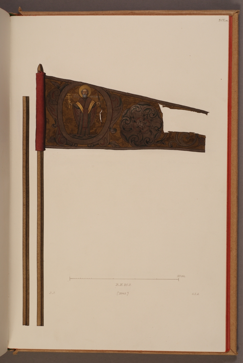 Titel: Avbildning i gouache föreställande fälttecken taget som trofé av svenska armén. Den avbildade vimpeln finns bevarad i Armémuseums samling, för mer information, se relaterade objekt.