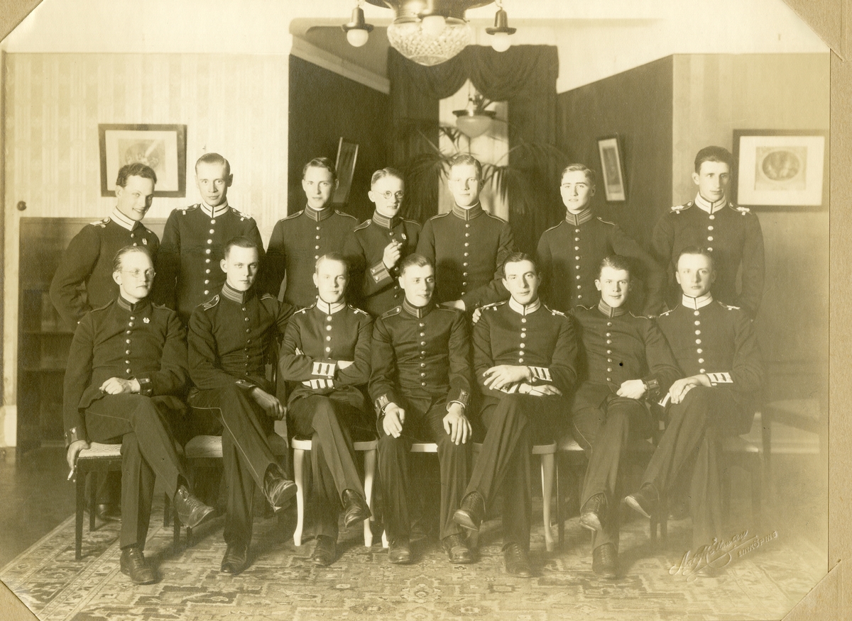 Grupporträtt av soldater från aspirantskola i Linköping 1928-1929.