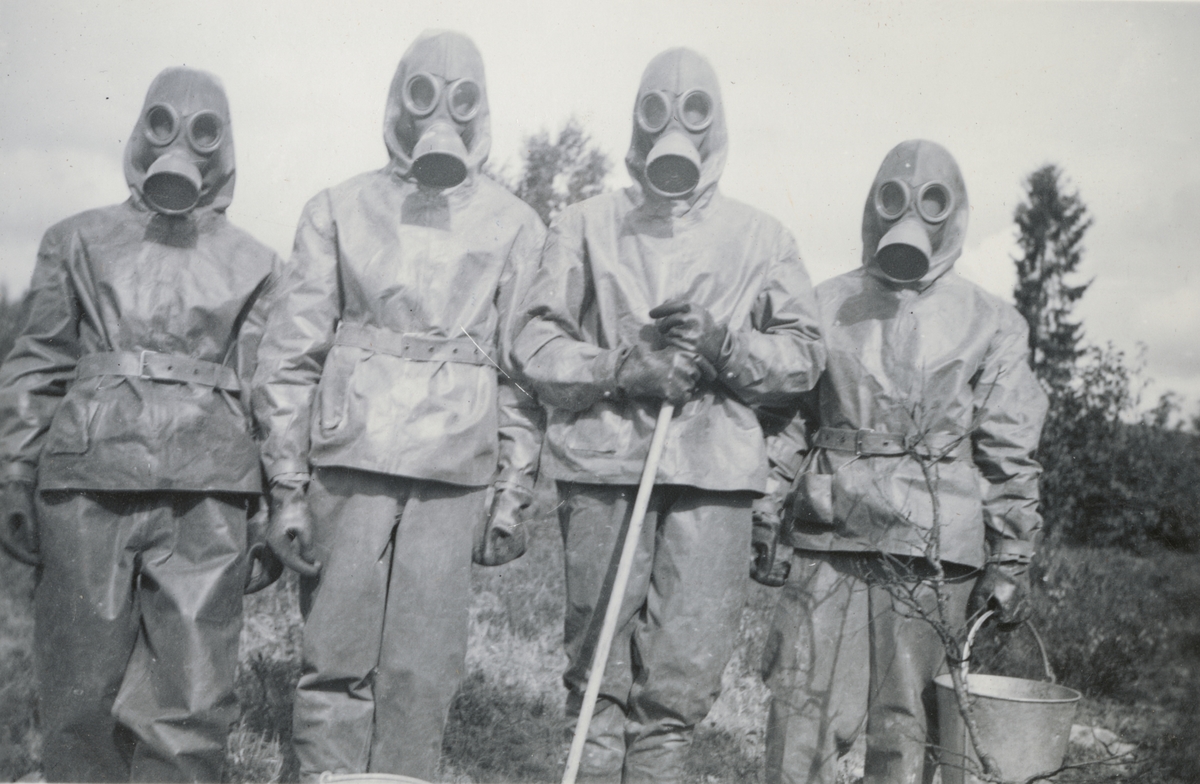 Titel: Gruppbild med soldater från Södermanlands regemente I 10 klädda i gasmask och skyddskläder.