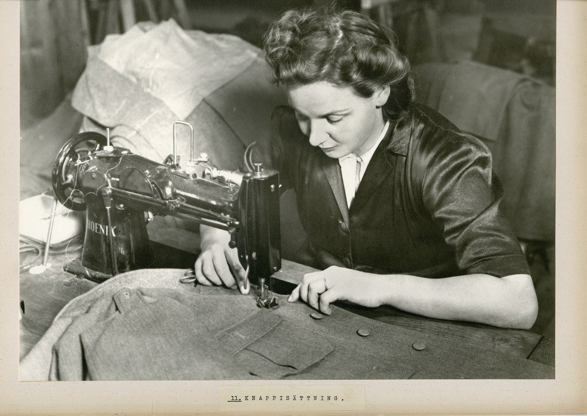Titel: Kvinna vid symaskin syr i knappar i vapenrock.