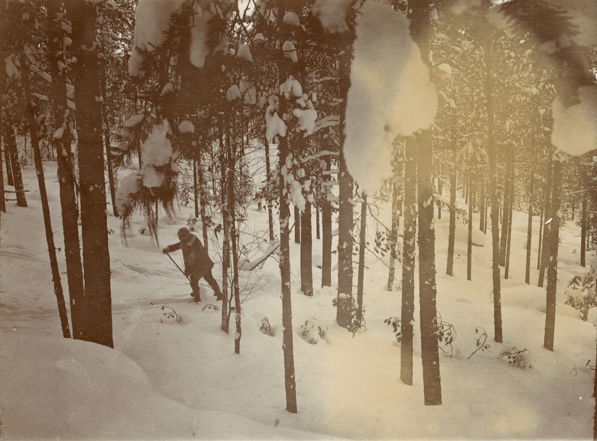 Titel: Officerare från Smålands husarregemente K 4 på skidor, vinterövning i Norrbotten omkring 1910.