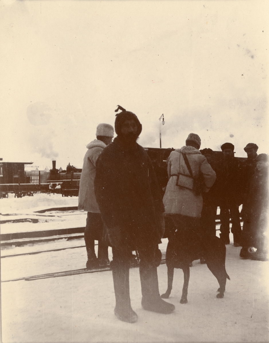 Titel: Officerare från Smålands husarregemente K 4 och civila under vinterövning i Norrbotten omkring 1910.