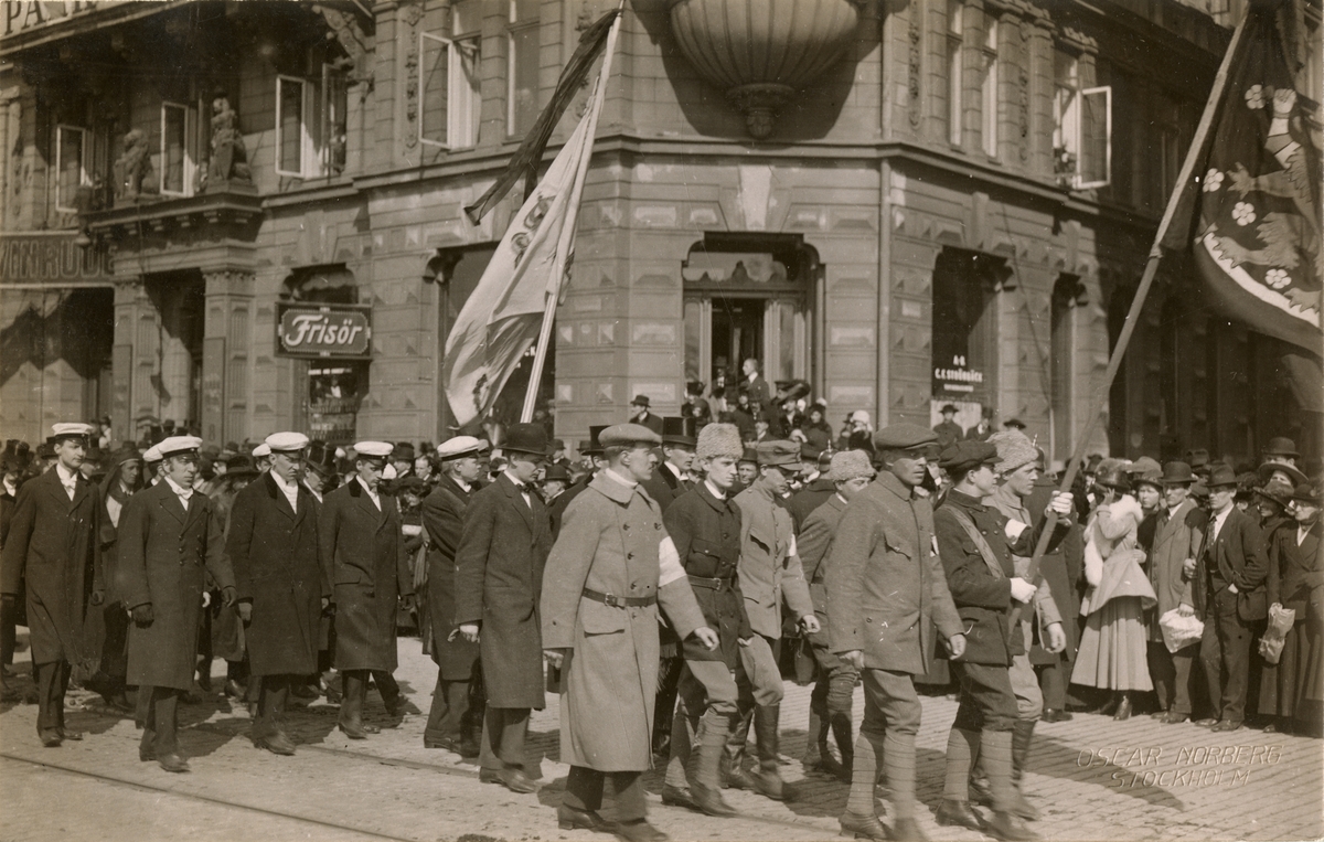 Text i fotoalbum: "Svenska brigadister i täten". Begravningsprocession.