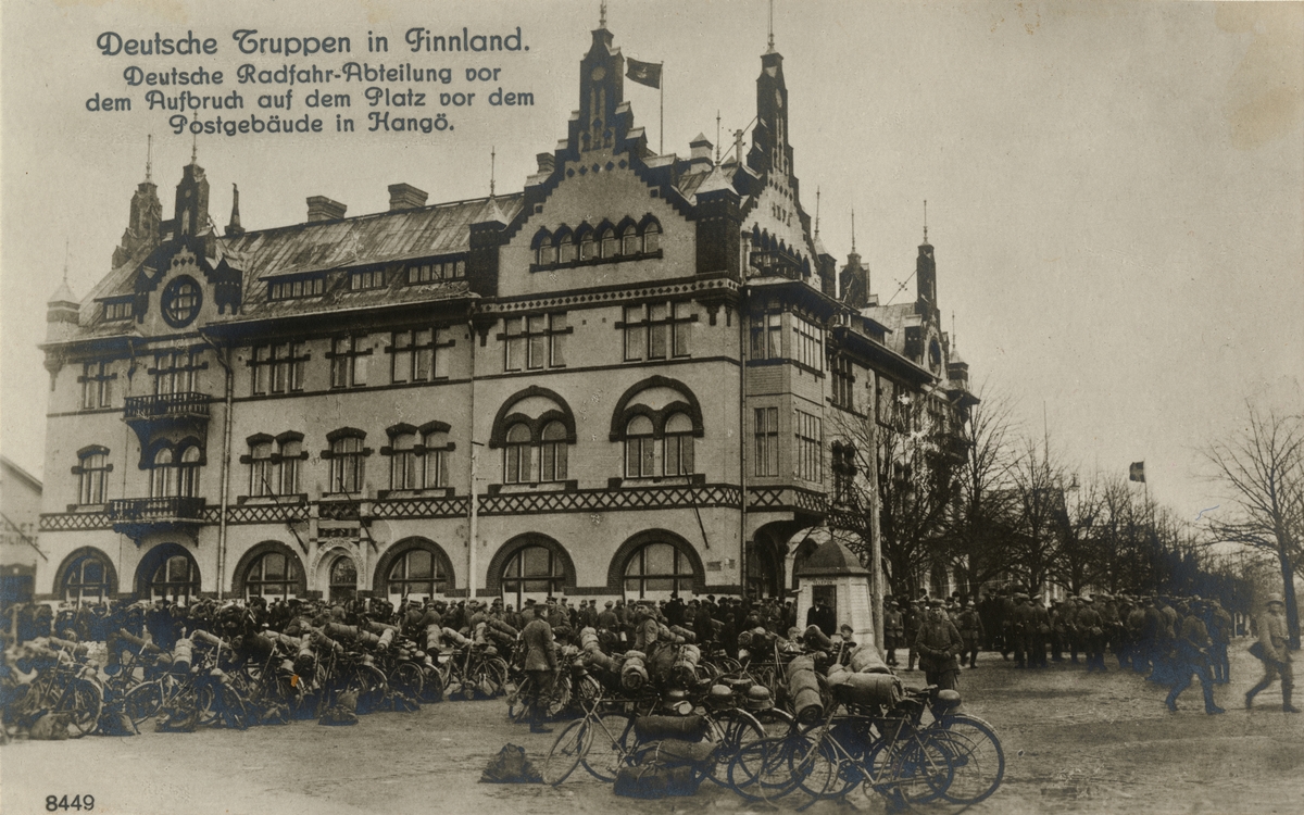 Text i fotoalbum: "Tyska trupper i Finland. Tysk cykelavdelning före avgång på torget framför postkontorsbyggnaden i Hangö".