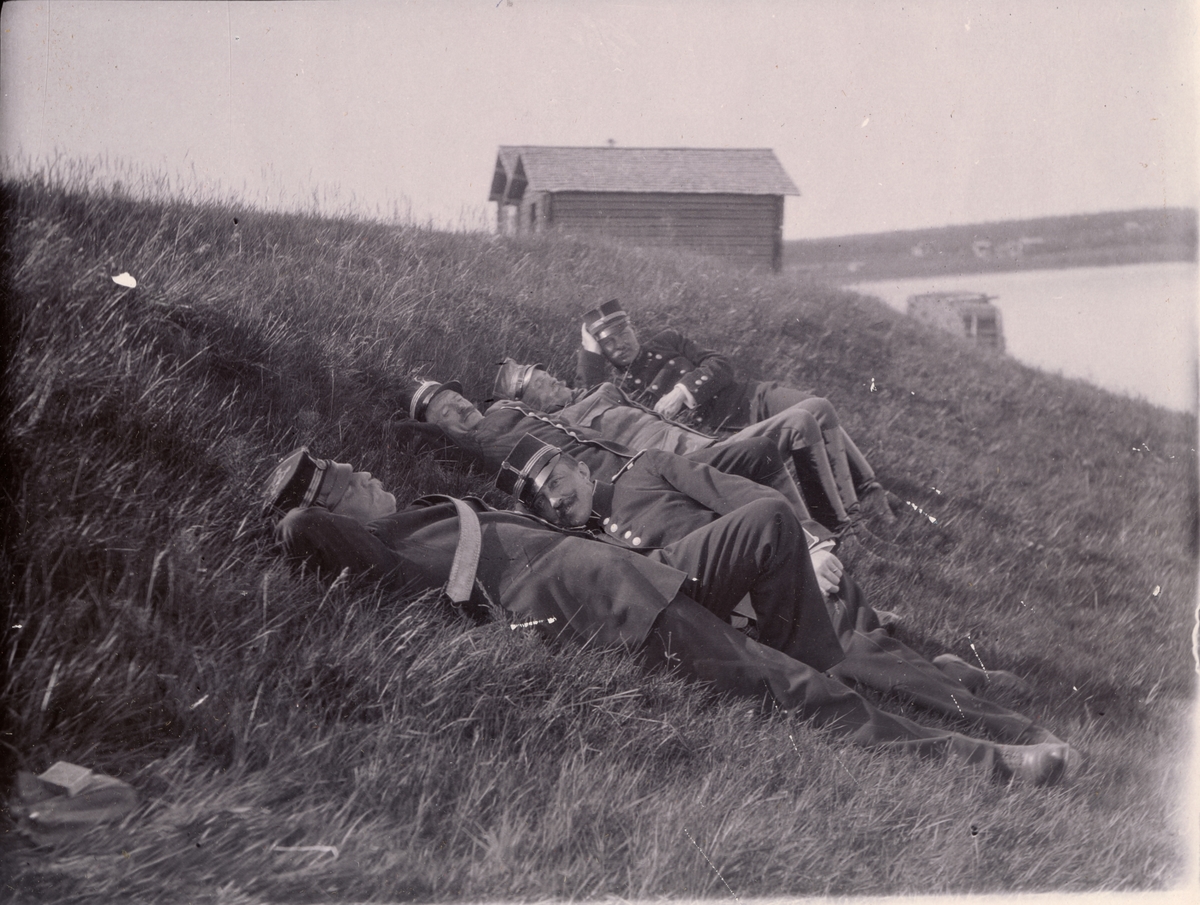Text i fotoalbum: "I väntan på öfverskeppning örver Kalix älf. Frölich, Törnell, Läkare, Lie, Carleson."