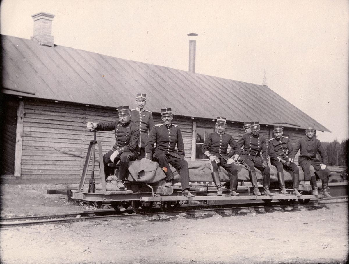 Text i fotoalbum: "Färd upp till fort i Boden. Sjögreen, Frölich, Carleson, Törnell, Björkman, Lie, Rappe."