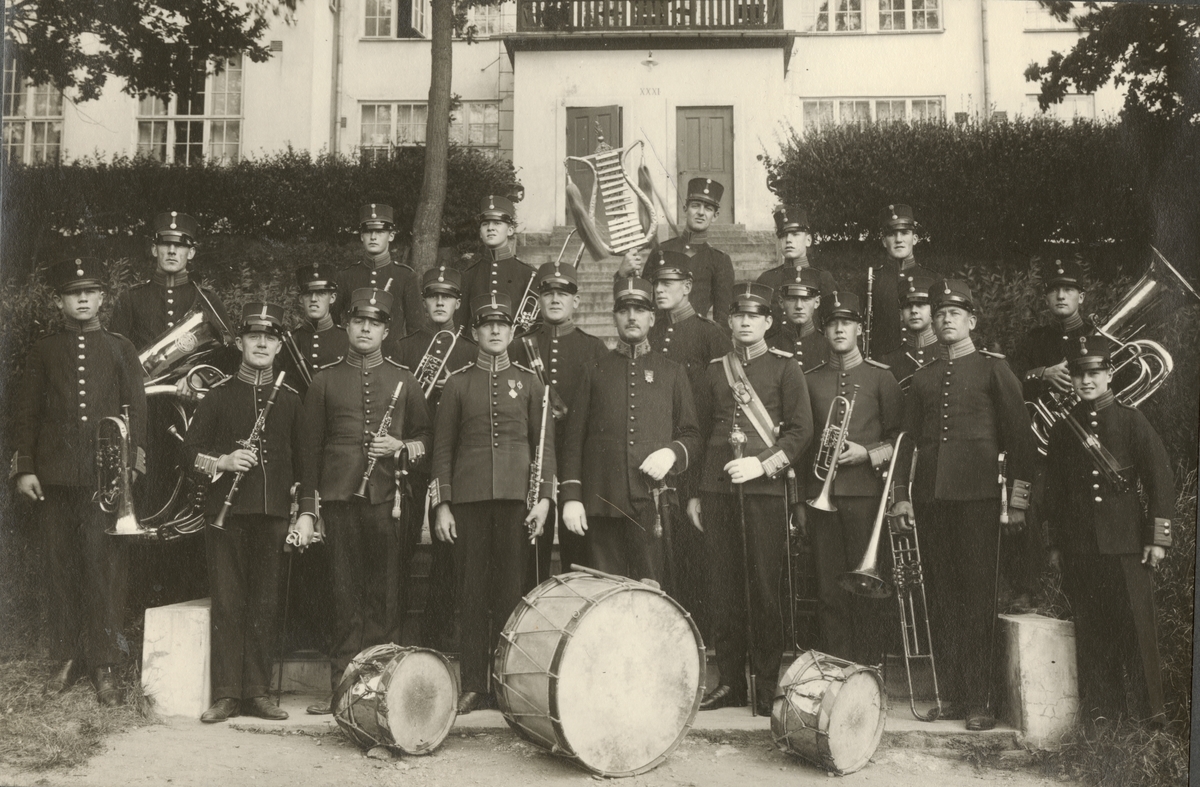 Bildtext: "K. Vaxholms grenadjärregementes musikkår i vardagslag. Holm-Bratt-Johansson-Pegel-Pettersson-Pson-Rising-Johanssons son."