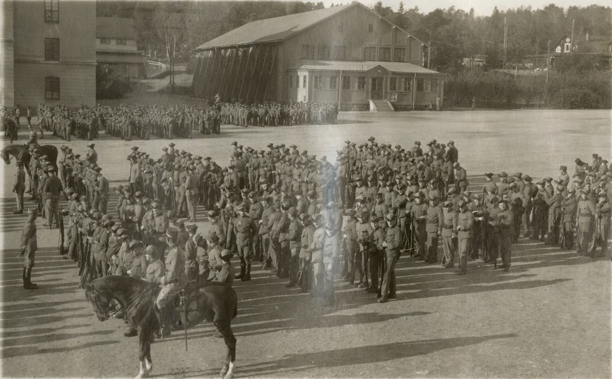 Bildtext: "Sista årets regementesövningar vid I 26 för ego (Allan Hasselrot). Regementet ställer upp till exercis. 8. komp: närmast. (dess officerare fr. v: ego (Allan Hasselrot), Eric Carlberg (till häst), Kalling)."