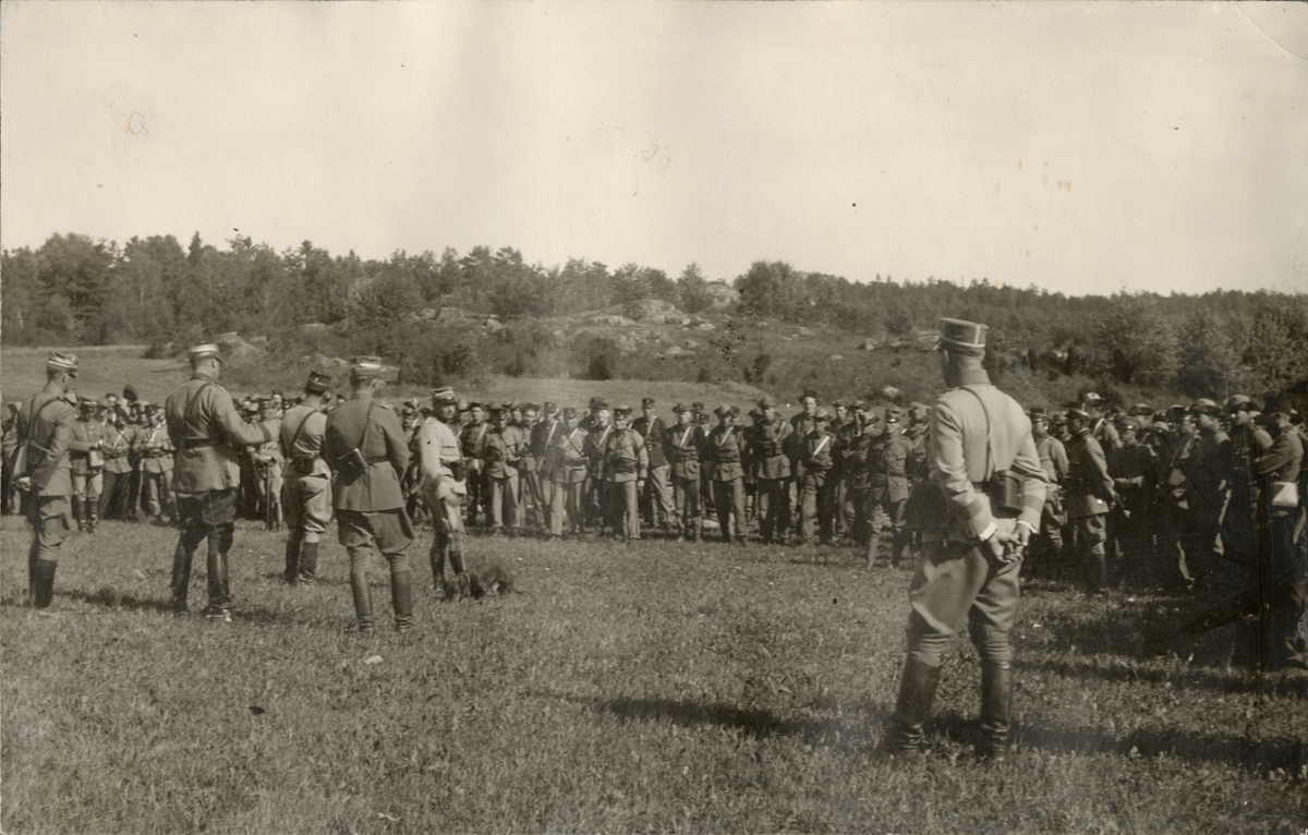 Bildtext: "Sommaren 1926: Fahlström (och Pullman) leder "övningar i sammanslagna förband" på Värmdö. Fr. v.: ego (Allan Hasselrot), W. Carlberg, Strömholm, Forselius, Fahlström, Beckman, Pullman, D. Lindberg, Holtz, Wide, E. Carlberg."