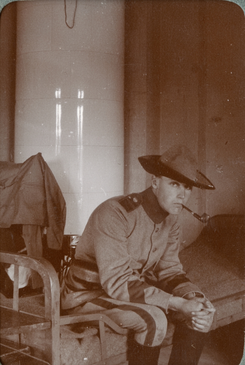 Titel: Soldat från Kronprinsens husarregemente K 7 i logementet.
