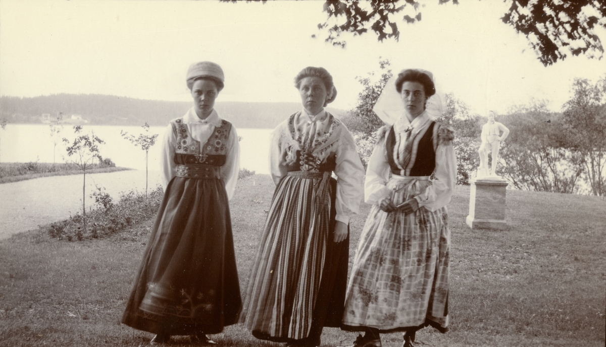 Titel: Systrarna i nationaldräkter framför Malmsjön.