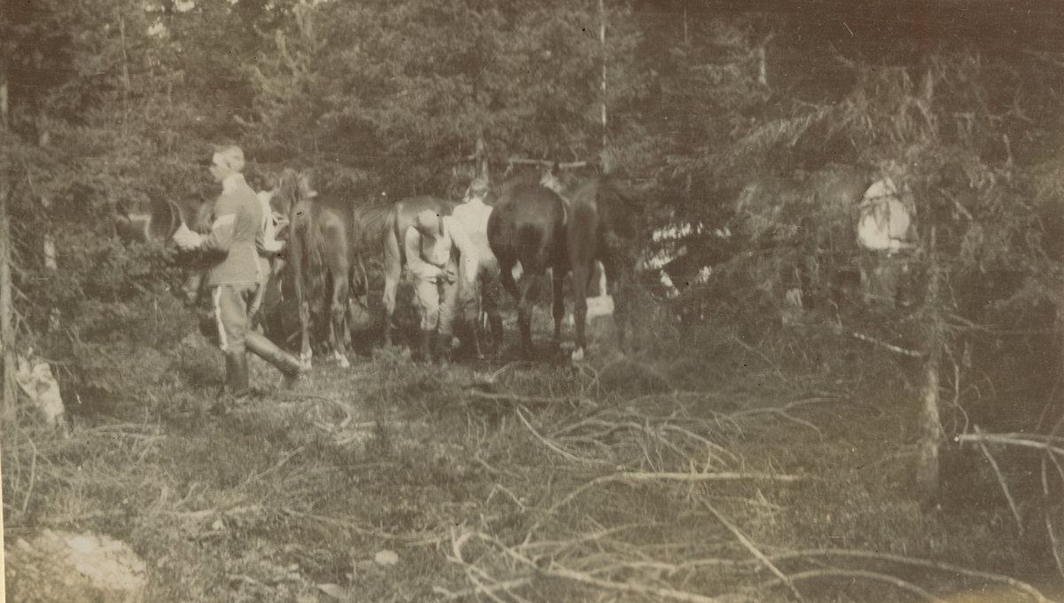 Elever vid Kavalleriskolan ryktar hästarna i skogen, Umeå.
