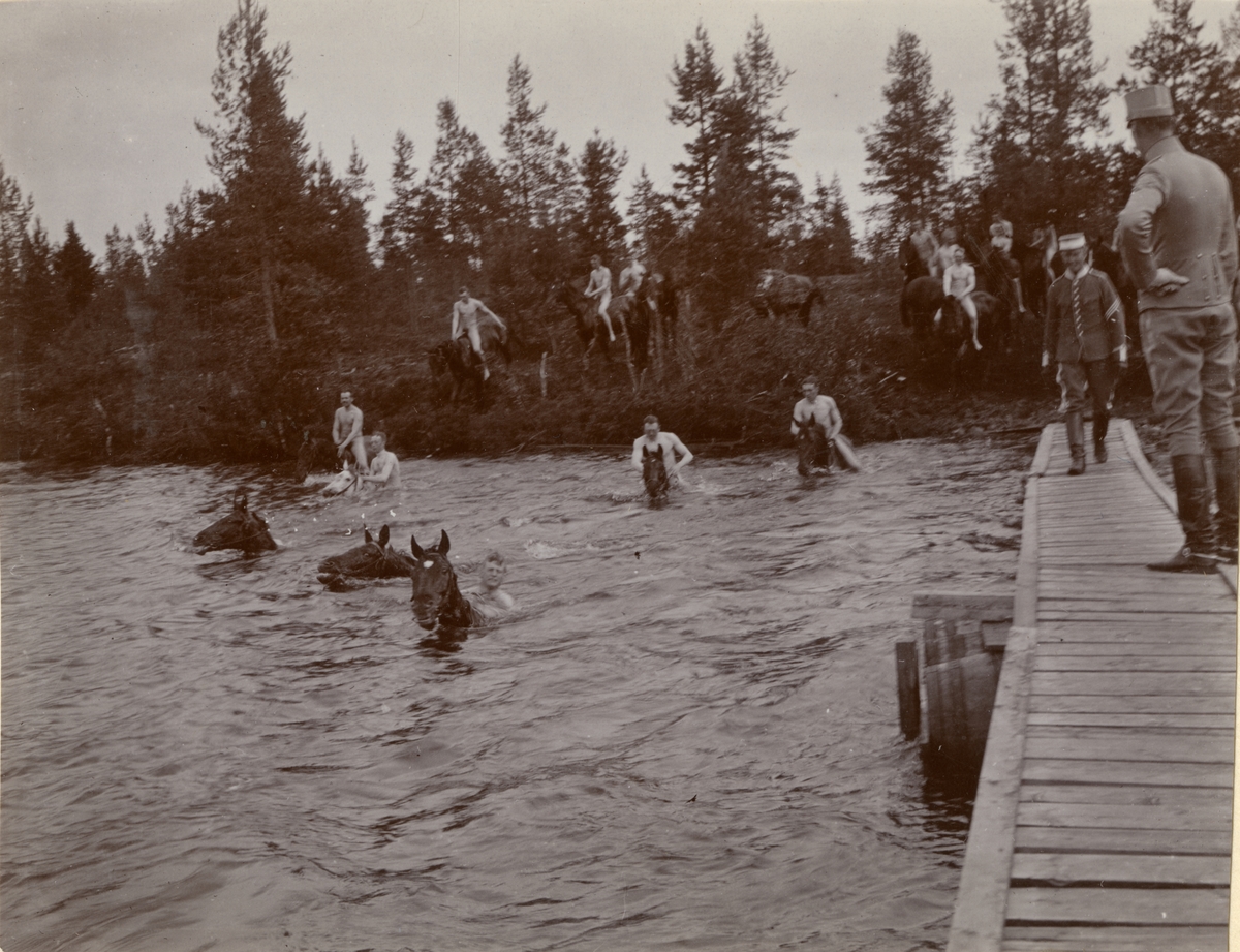 Titel: Elever vid Kavalleriskolan i Umeå simmar med hästar i Piparbölesjön.