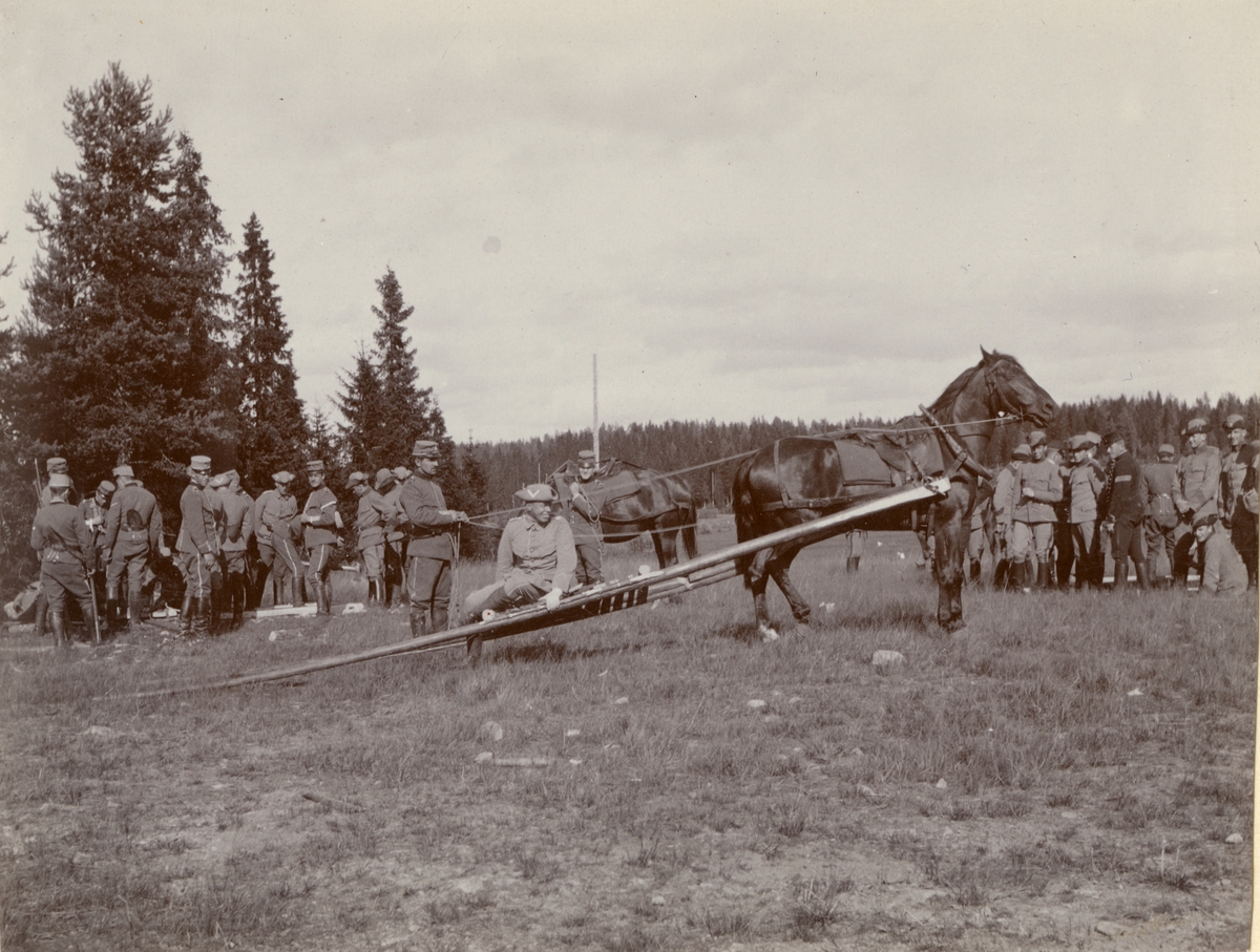 Titel: Löjtnant Carl Knös vid Kavalleriskolan i Umeå på en släpbår efter häst.