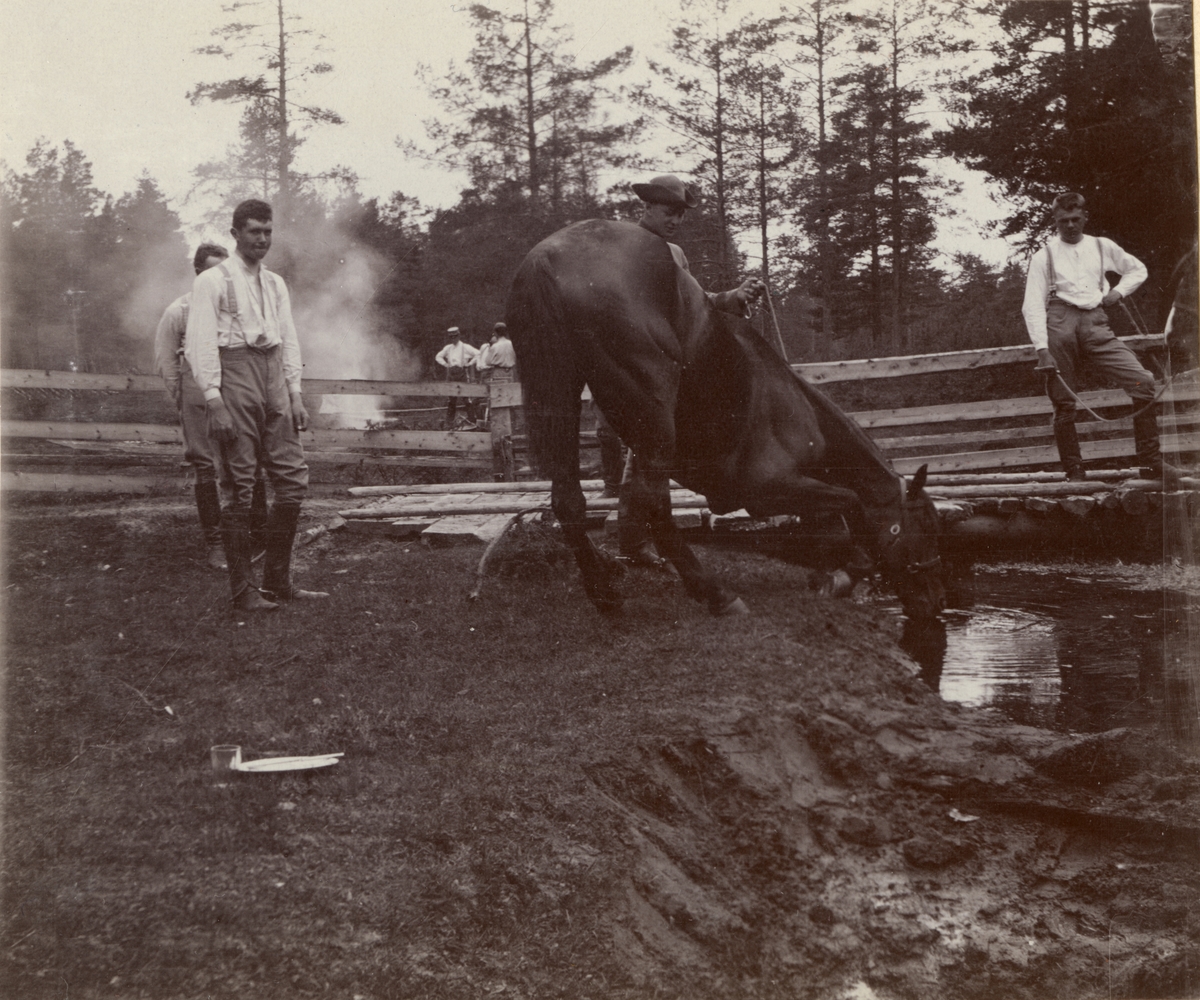 Titel: Elever vid Kavalleriskolan i Umeå vattnar hästarna.