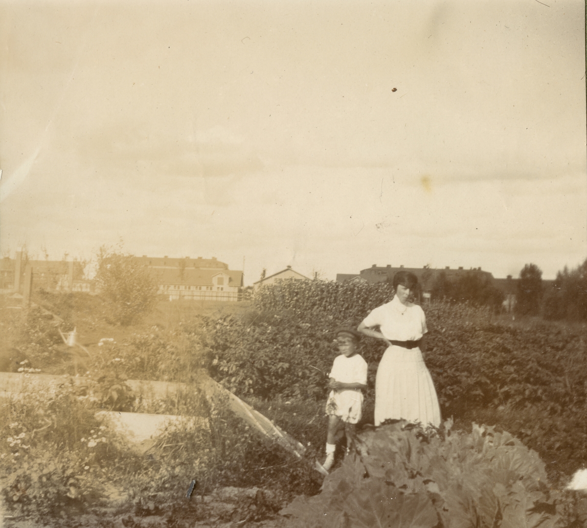 Titel: Kvinna med barn på trädgårdsland.