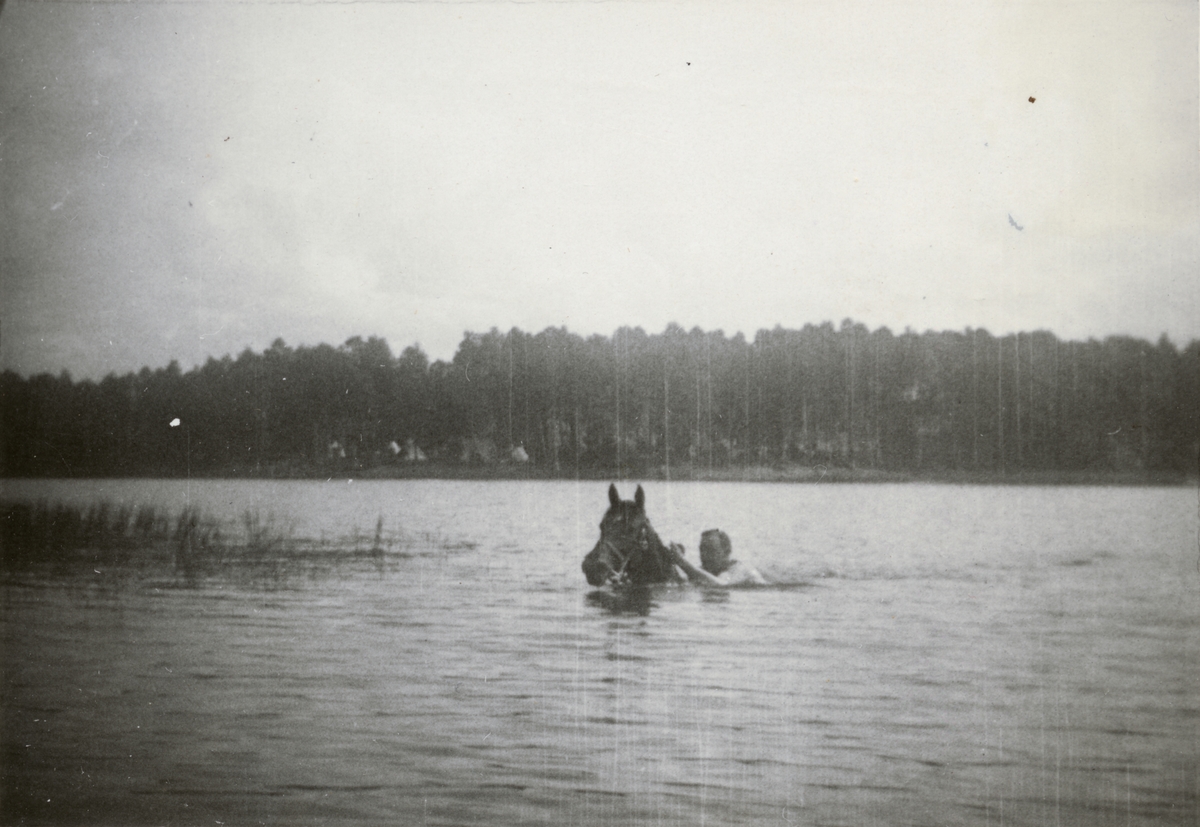 Titel: Text i fotoalbum: "Sommarmarschen 1937 till Varnum (norr Ulricehamn). Simning med häst".