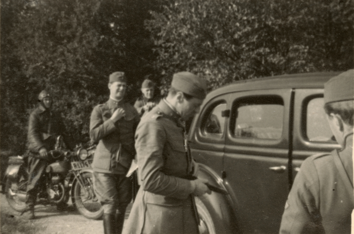 Text i fotoalbum: "Augustimanövern 1938. Stridssomargruppen: Öl Ribbing, Ryttm Douglas, Ljtn Claes v. Essen".