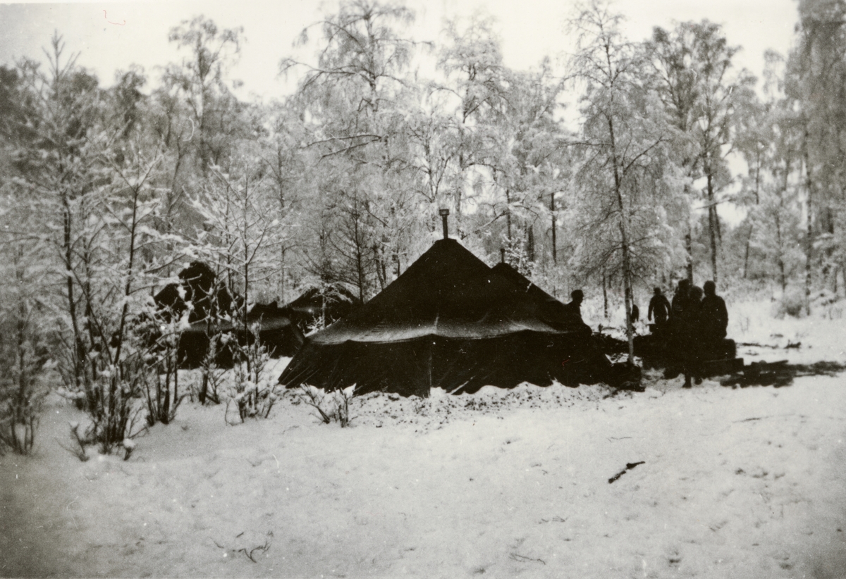 Text i fotoalbum: "Komissarieskolan vid I 9 Depå Axvall 1/10 1941- 1/2 1942. Vinterbivack söder Mariestad (-22)".