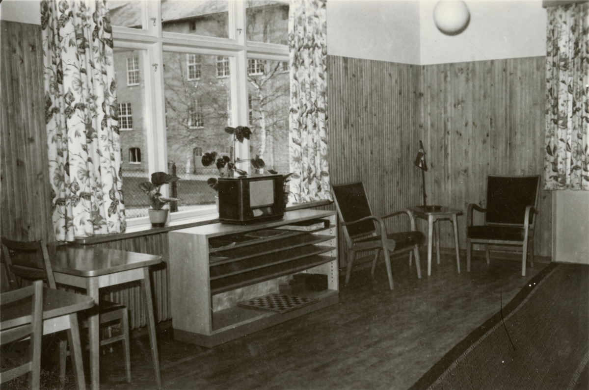 Text i fotoalbum: "I 12 nya ubefälmäss och bibliotek, fådigbyggd 1943. Arkitekt M. Montgomery. Korpralsmässens sällskapsrum".