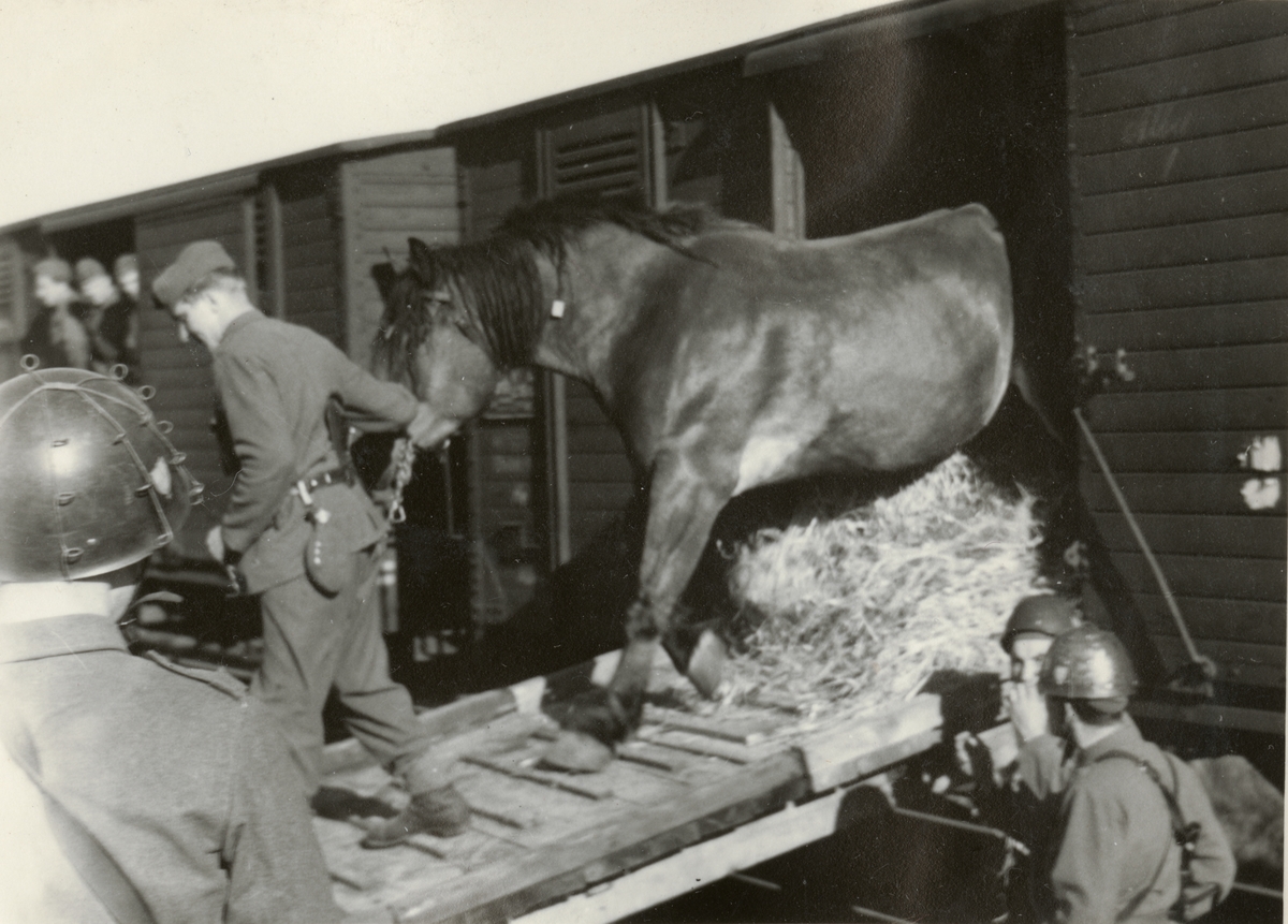 Titel: Text i fotoalbum: "Brigfälttjänstövning hösten 1950. Urlastning på linjen i trakten av Fjugesta".
