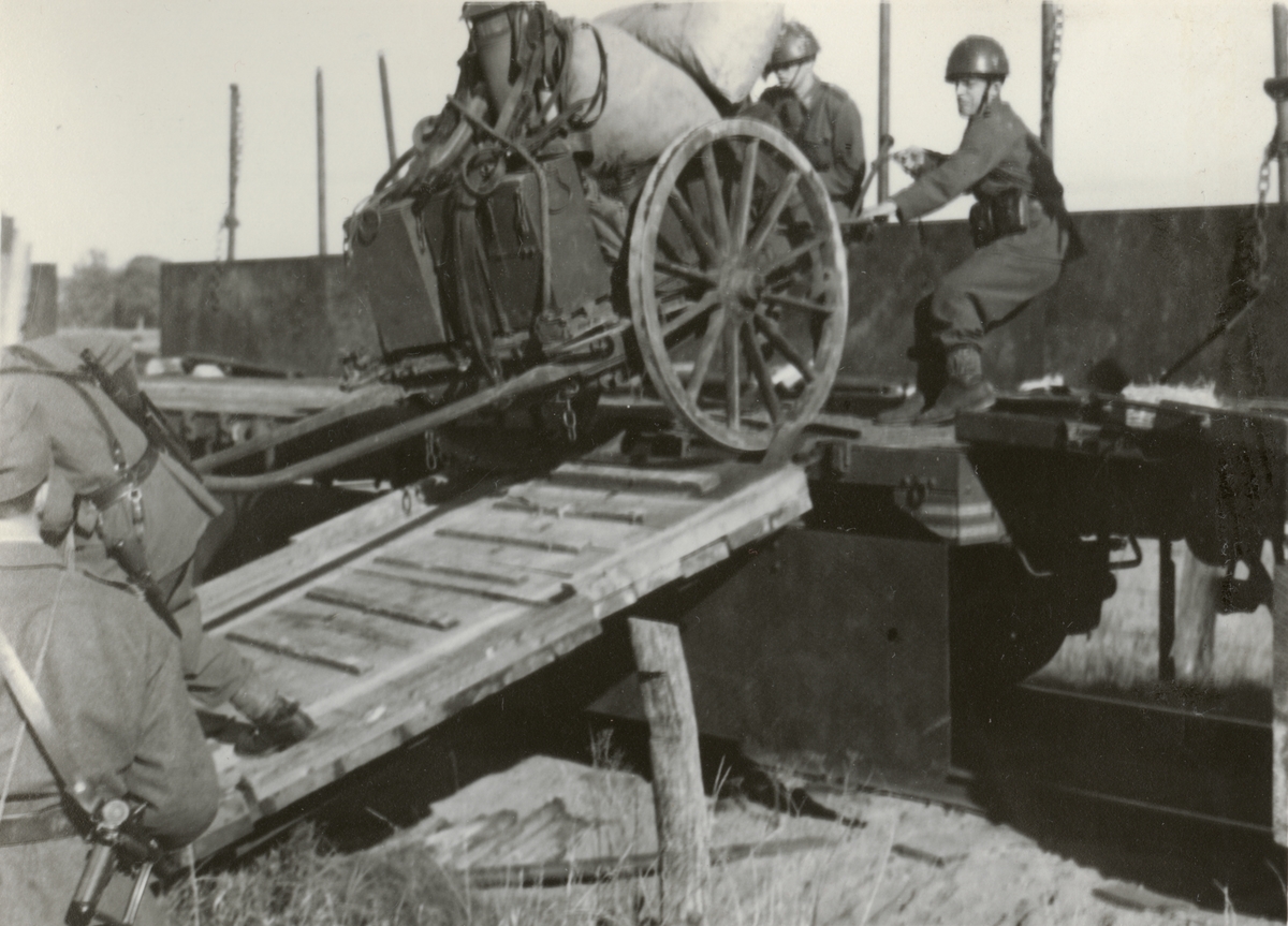 Titel: Text i fotoalbum: "Brigfälttjänstövning hösten 1950. Urlastning på linjen i trakten av Fjugesta".