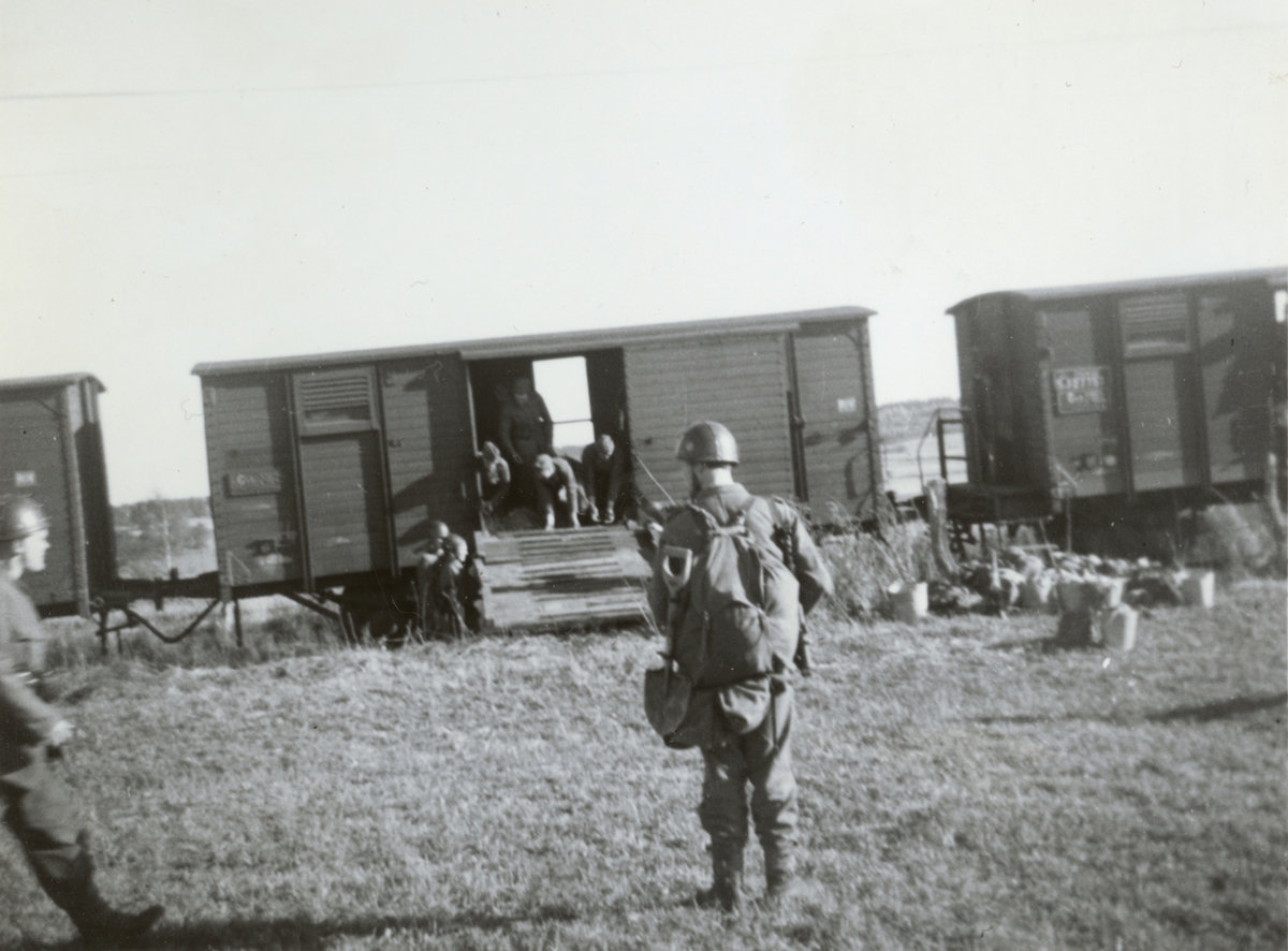 Titel: Text i fotoalbum: "Brigfälttjänstövning hösten 1950. Urlastning på linjen i trakten av Fjugesta".