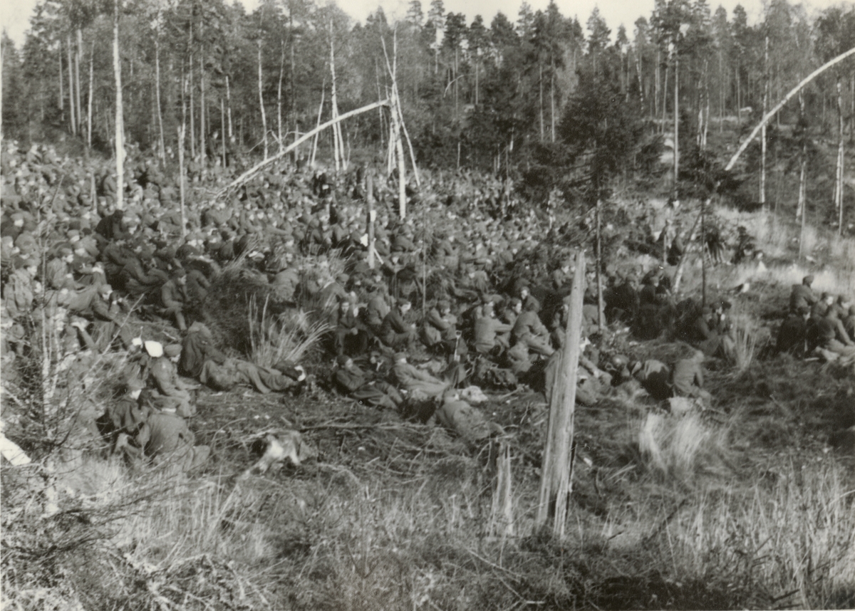 Text i fotoalbum: "Brigfälttjänstövning hösten 1950. Trupp som åskådare till skarpskjutning på Villingsberg".