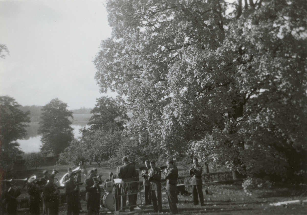 Text i fotoalbum: "IV-V milo fälttjänstövning hösten 1952. Musikkåren I 3 spelar vid fältlunchen i Vadstorp".