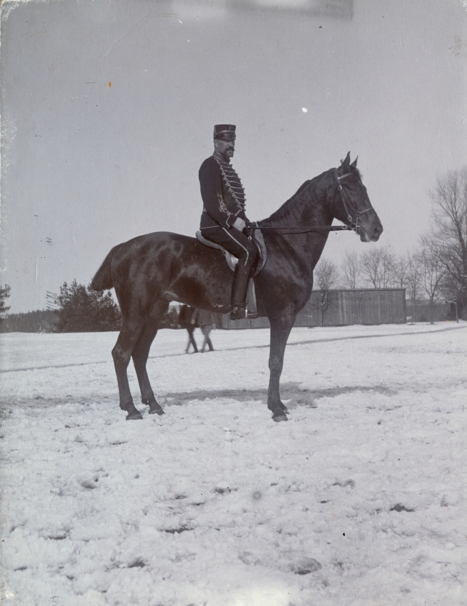 Titel: Text i fotoalbum: "Ränneslätt K 4 Kav. aspirantskola 1900". Soldat till häst.