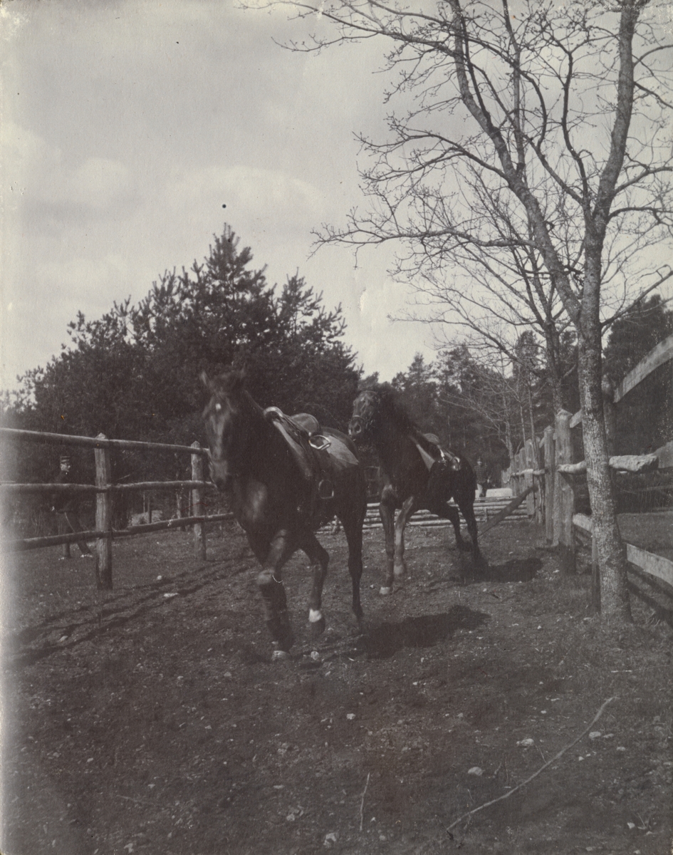 Titel: Text i fotoalbum: "Ränneslätt K 4 Kav. aspirantskola 1900". Hästar på övningsbana.