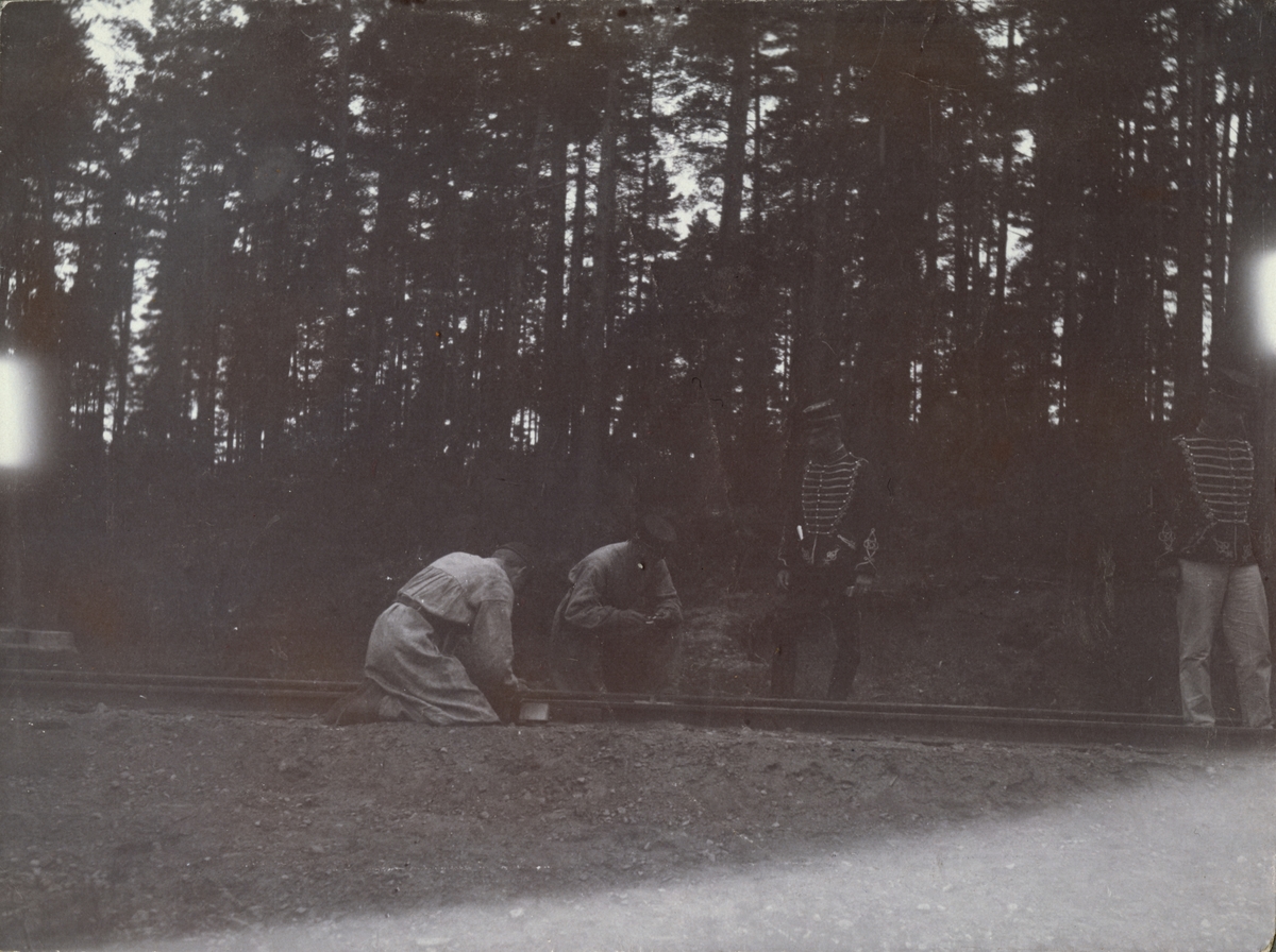 Titel: Text i fotoalbum: "Ränneslätt K 4 Kav. aspirantskola 1900". Soldater vid järnväg.