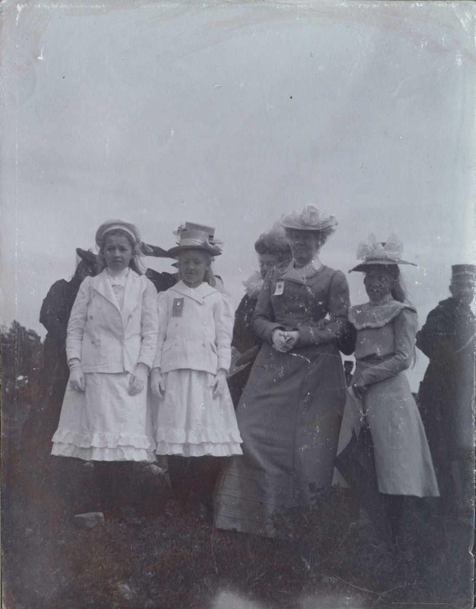 Titel: Text i fotoalbum: "Ränneslätt K 4 Kav. aspirantskola 1900". Samling av civila vid övningsplats.
