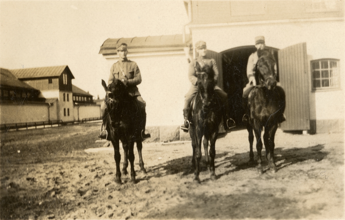 Titel: Text i fotoalbum: "Sommaren 1929. Skolkompaniet." Gruppbild med soldater till häst".