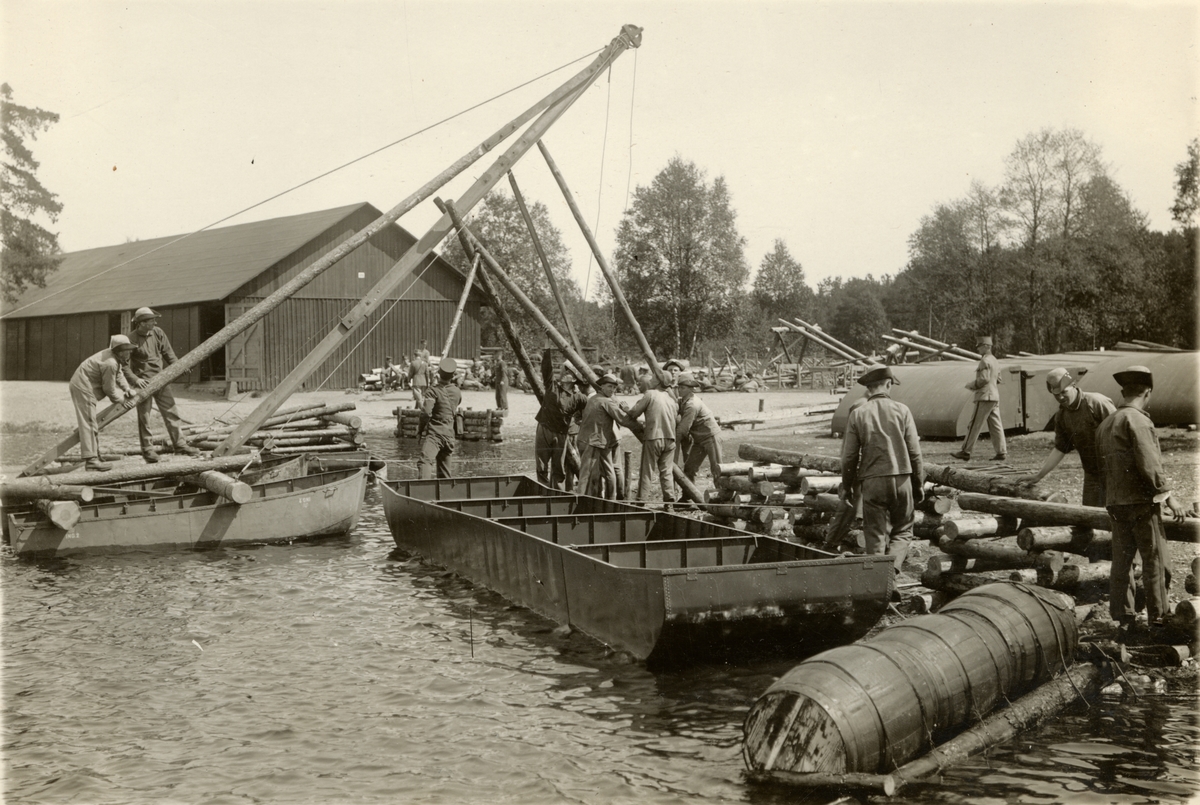 Titel: Text i fotoalbum: "Sommaren 1929. Fältbro vid Bjälmen. Pålkran."