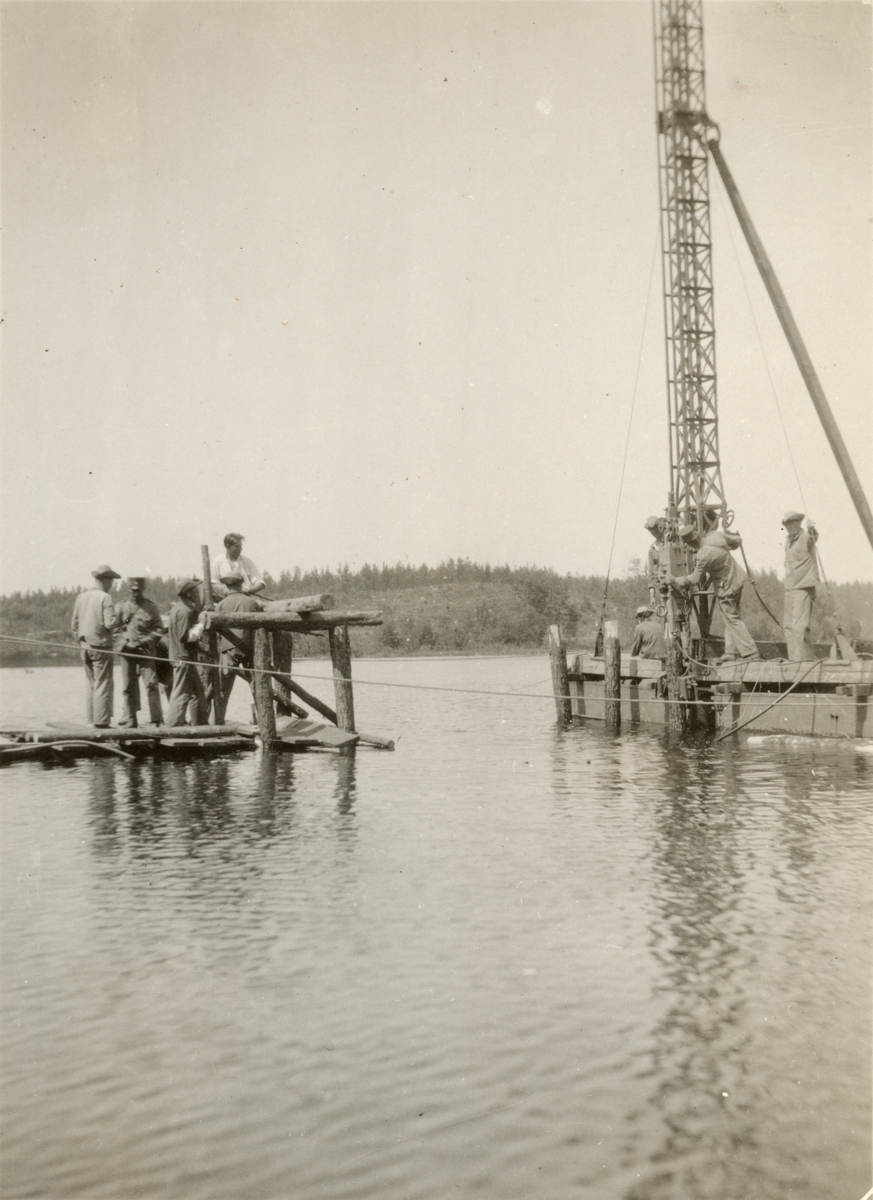 Titel: Text i fotoalbum: "Sommaren 1929. Fältbro vid Bjälmen. Pålkran."