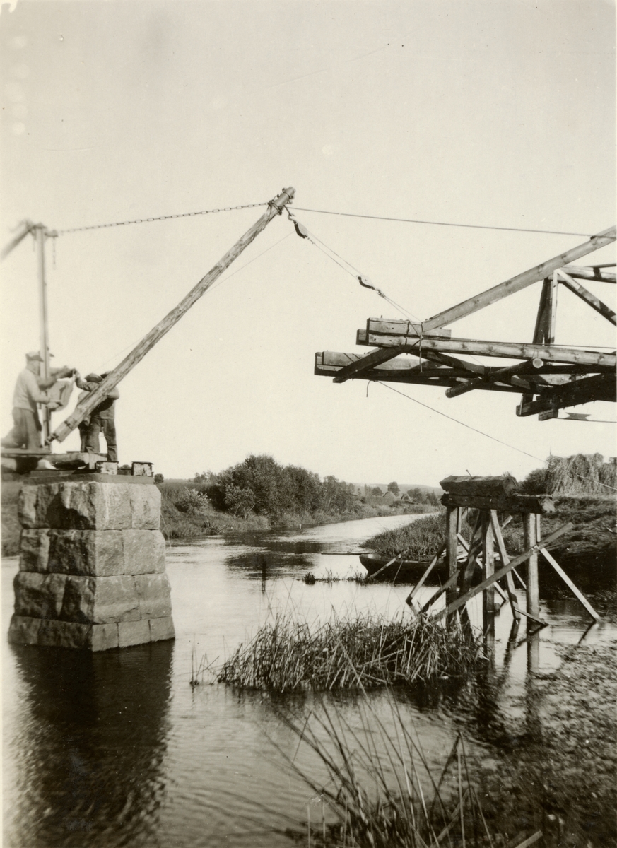 Titel: Text i fotoalbum: "Brobygget vid Gripenberg. Nya spannet vindas ut på sin plats."