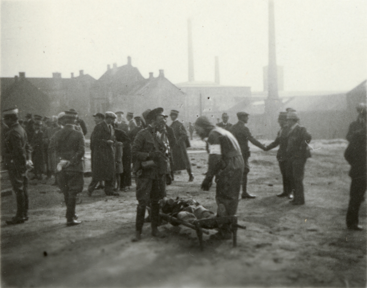 Text i fotoalbum: "1935. Okt. Luftförsvarsövningen i Skåne. "Anfallet" mot Hälsingborg. Sårade omhändertagas".