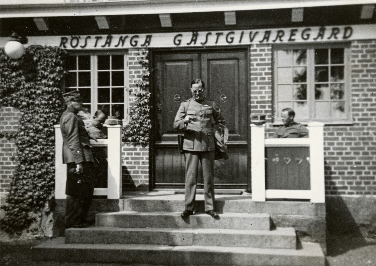 Text i fotoalbum: "1936 juni. Intendentur-fältövningen i Röstånga. Nilsson, Landgren, Krus*".