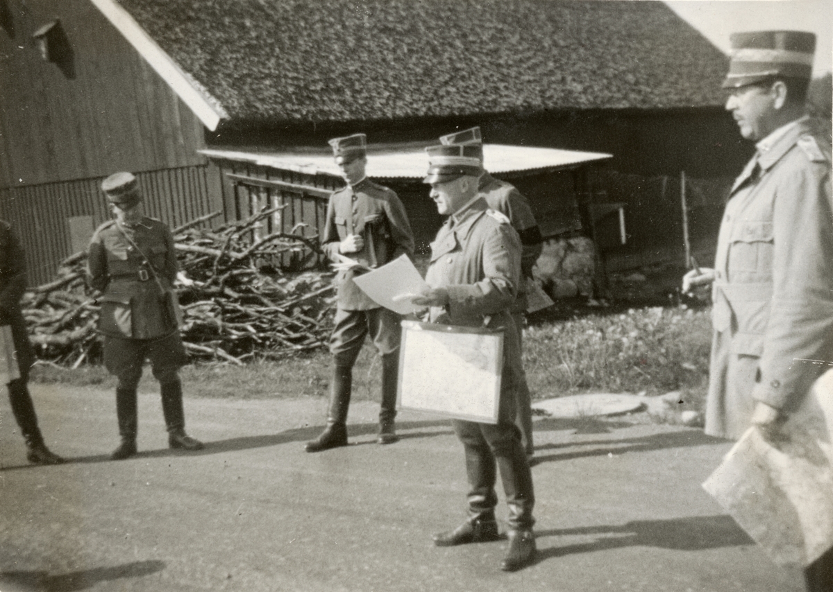Titel: Text i fotoalbum: "1936 juni. Intendentur-fältövningen i Röstånga. Genomgång av övningen. Kritik".
