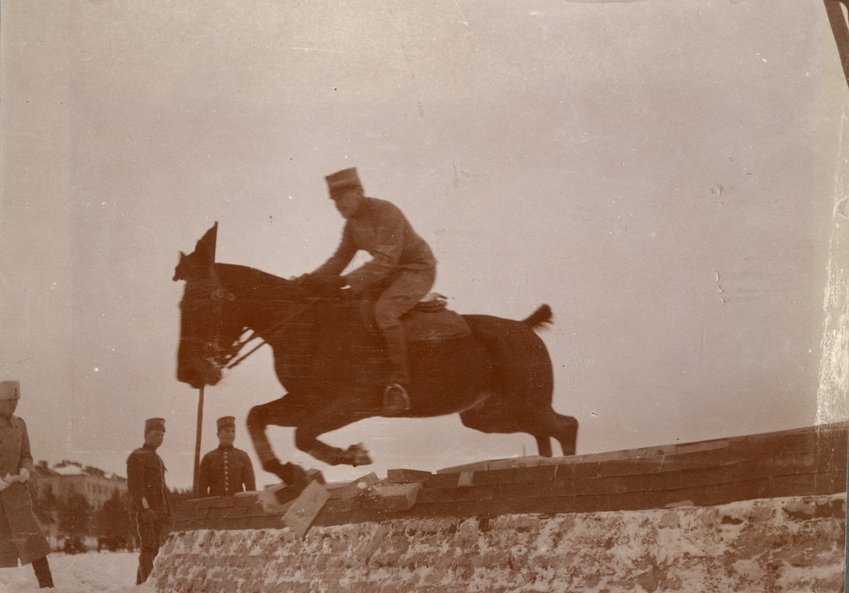 Titel: Text i fotoalbum: "Underofficersskolan 1911-1912 Umeå-Eksjö". Ridövning.