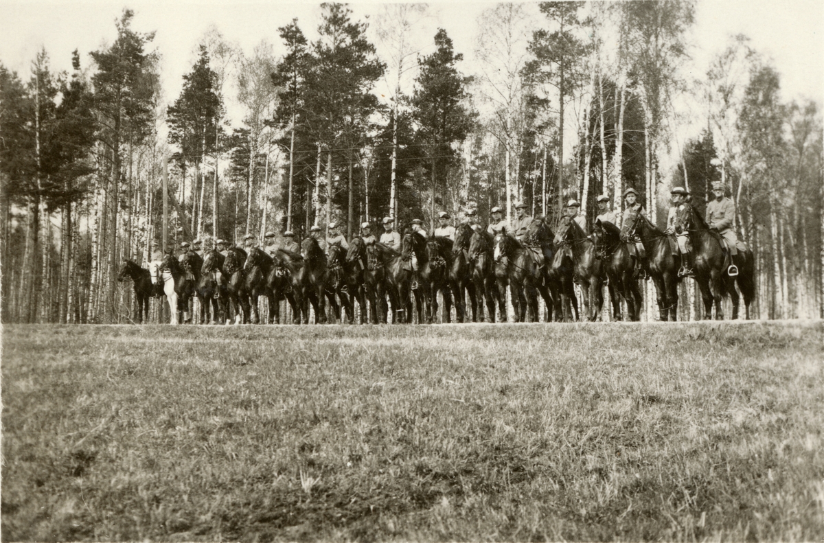 Text i fotoalbum: "Officersaspirantskolan 1925-1926. Ridutbildningen blev i början en svår stötosten, men så småningom blev man mer eller mindre sadelfast. Asp.skolan till häst".