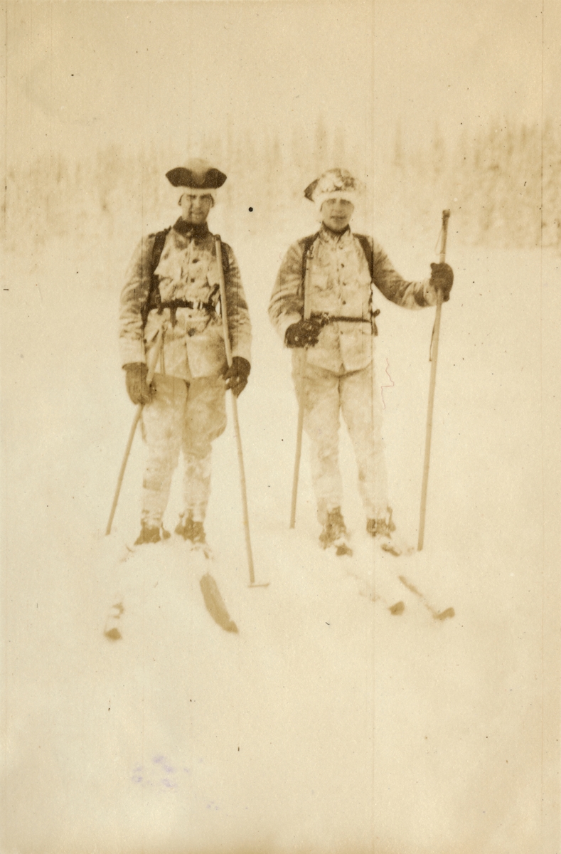 Text i fotoalbum: "Aspirantskolans vinterövningar i Björnänge febr.-mars 1926. Backåkningens fröjder. Rodhe, Klint".