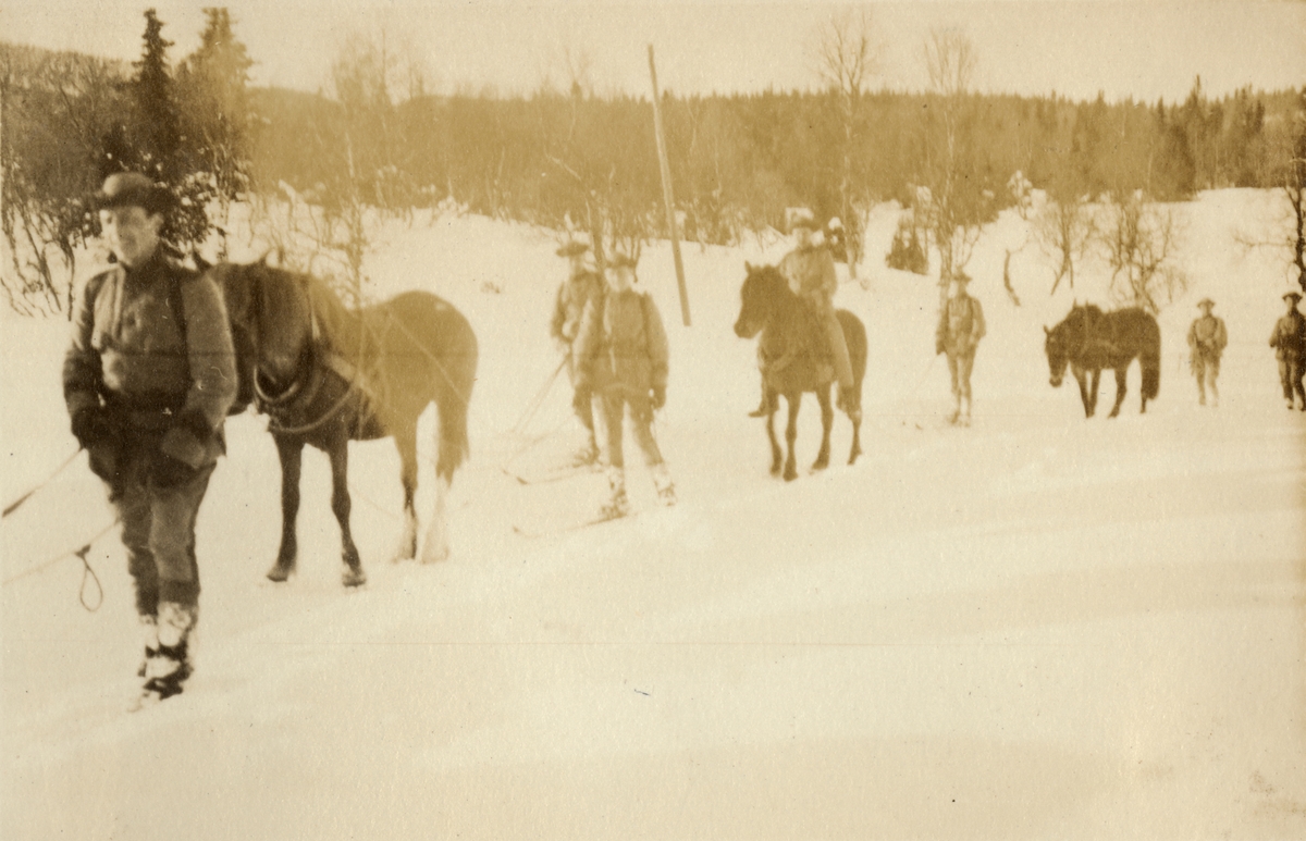 Text i fotoalbum: "Aspirantskolans vinterövningar i Björnänge febr.-mars 1926. En dag tolkade vi till Tännforsen och tillbaka".