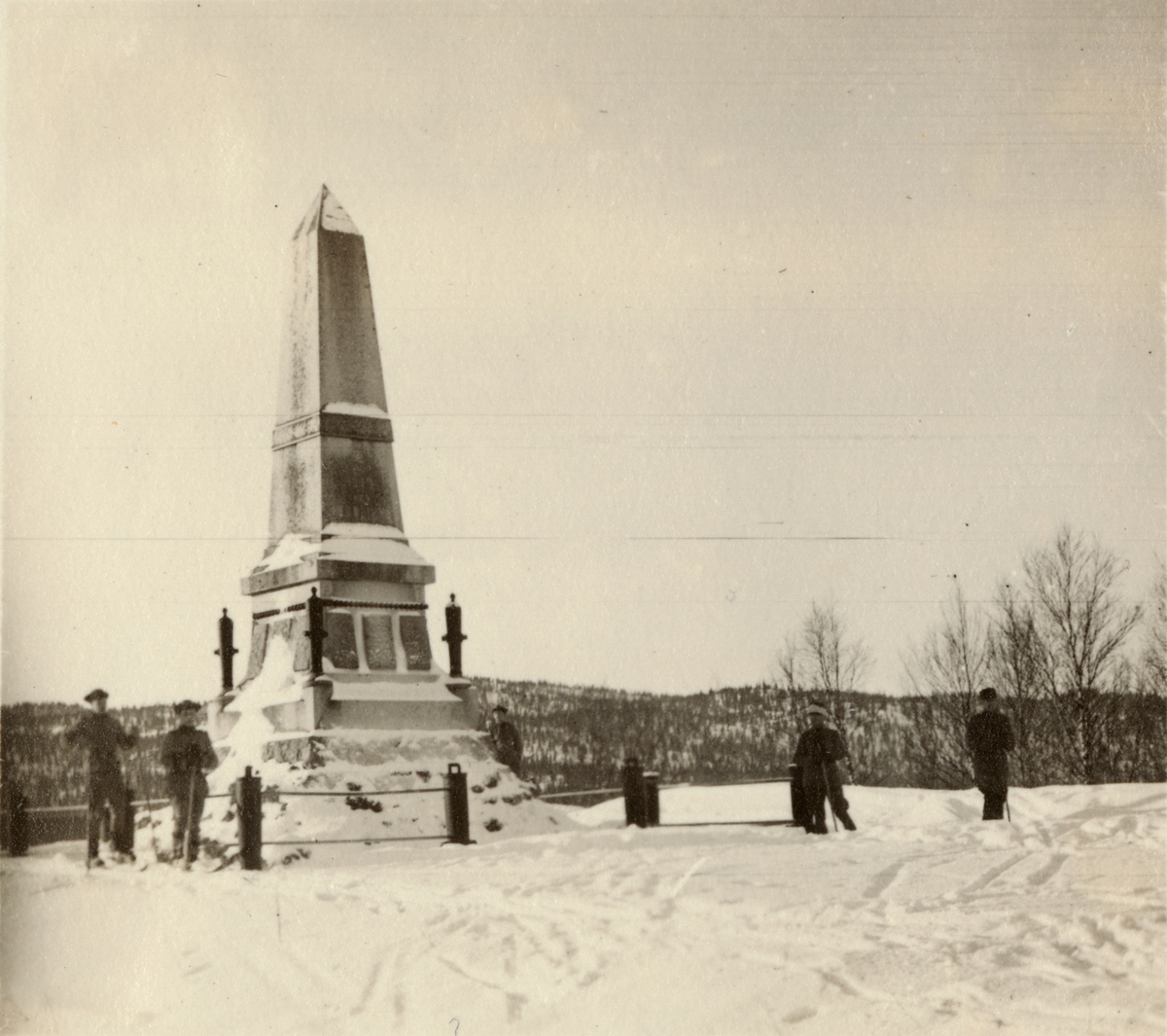 Text i fotoalbum: "Aspirantskolans vinterövningar i Björnänge febr.-mars 1926. En dag tolkade vi till Tännforsen och tillbaka. Karl XII:s monument i Duved och utsikten därifrån mot Åre".